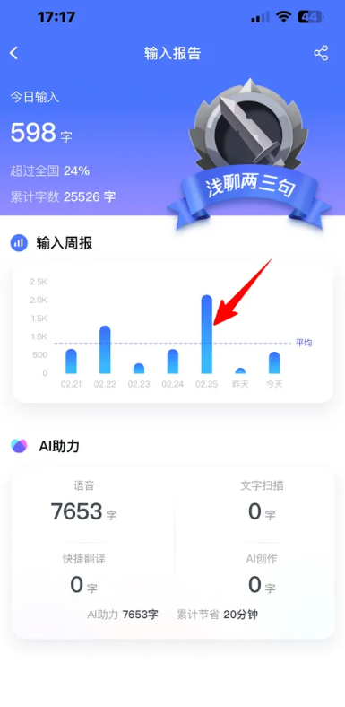 4、这时,我们就能看到输入法的统计报告了。如果想查看某一天具体打了多少字,可以点击输入周报中的长条图形。
