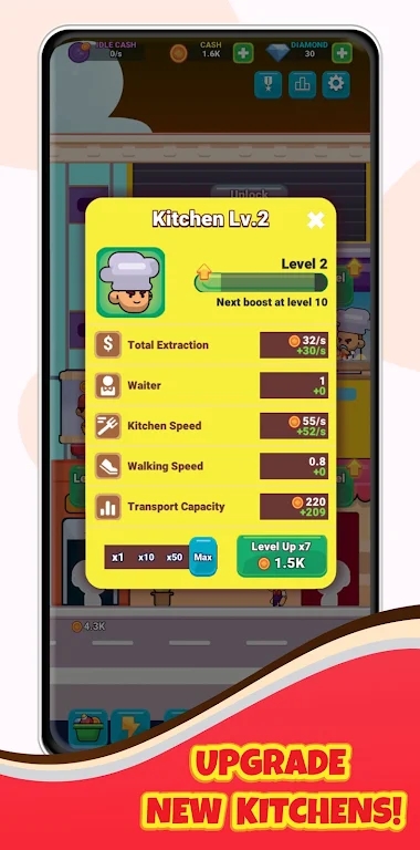 3、游戏的难度不是很高,拥有独特的闲置玩法,即便是玩家在离线状态也能够获得收益,让你轻松成为一名餐饮界的大亨人物。