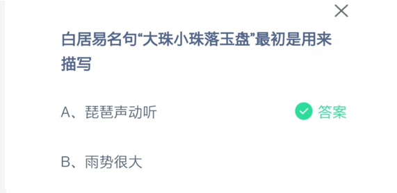 白居易名句“大珠小珠落玉盘”最初是用来描写?这是支付宝蚂蚁庄园7月15日的每日一题问题,相信大家都听过或者学习过这句诗,但是很多小伙伴不清楚这句诗具体描写的是啥意思,今天小编就为大家带来7月15日每日一题的答案,只要能够回答出来就可以获得180g饲料的奖励,有需要的小伙伴就赶紧来这里看看吧。