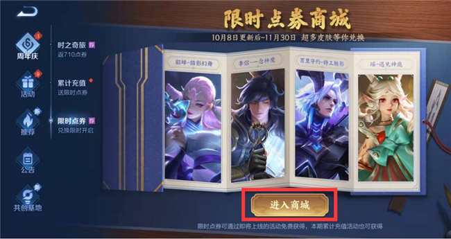 王者荣耀中目前还在开展着限时点券的活动,参与到活动的玩家小伙伴是可以通过限时点券在活动期间进行购买对应的英雄皮肤,那么限时点券具体又是在游戏上商城中的什么位置呢,下面小编就为大家带来关于《王者荣耀》限时点券商城位置介绍。