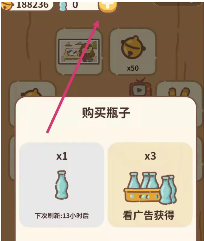 二、第二种就是点击瓶子旁边黄色“+”号后通过铃铛购买和看广告来获得;