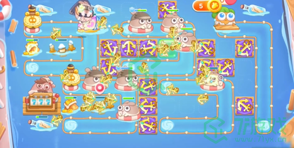 1、开局,在上方和右侧位置,放置船锚并升级,可有效清理前期出现的怪物和路障。