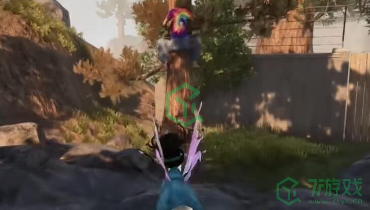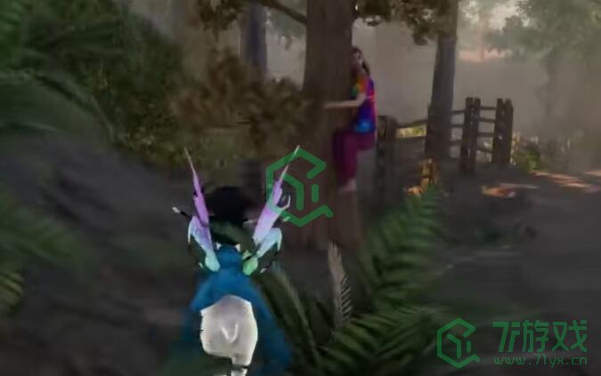 7、然后往河对岸看到楼梯后走上去,在楼梯顶层可以看到第五个抱树者。
