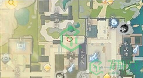 1、在勾栏对面的楼梯旁边接取,也就是下图标记的红圈位置。