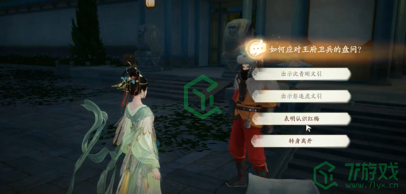 1、开局与王府卫兵对话,选择【表明认识红梅】、【疑似故人,暗中观察】;