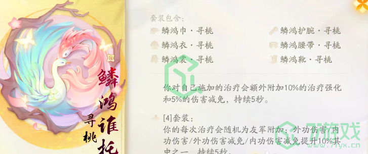 2、四件套:治疗队友时将额外获得一个随机效果:外功伤害提升/内功伤害提升/外功伤害减免/内功伤害减免。