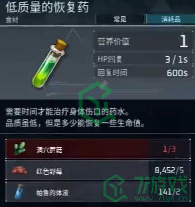 1、低质量的恢复药:洞穴蘑菇X3、红色野莓X5、帕鲁的体液X2