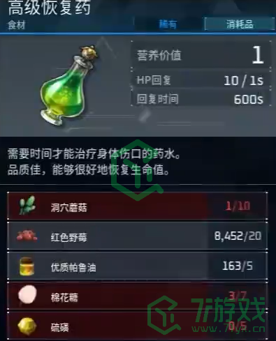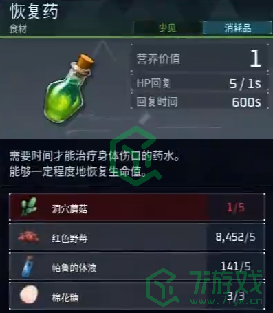 答:使用洞穴蘑菇X5、红色野莓X5、帕鲁的体液X5、棉花糖X3即可制作恢复药