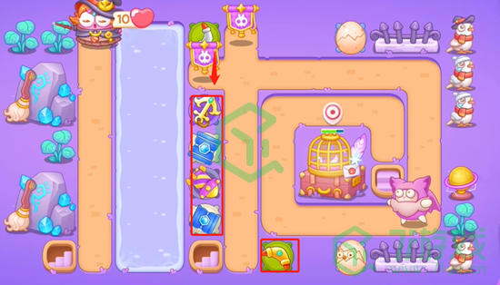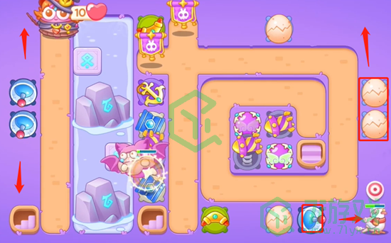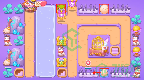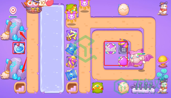 1、开始在上面放一个大鸡蛋清理兔子,然后在下面放鸡蛋清理两边的道具,在出口放回旋镖。