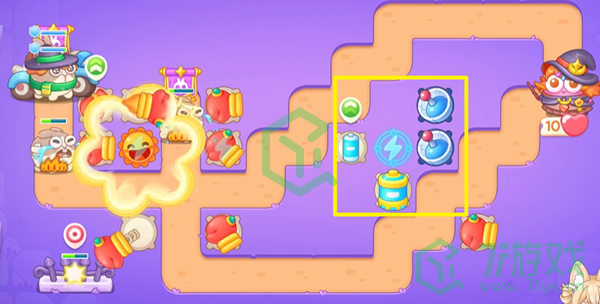 2、等左侧的障碍物被清理差不多的时候,先升级拳击炮塔,宝箱打开获得太阳花将其升到满级。