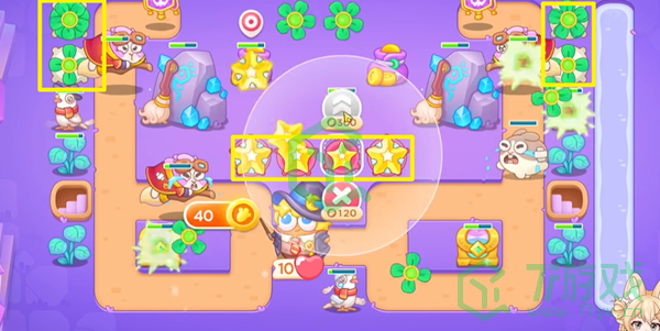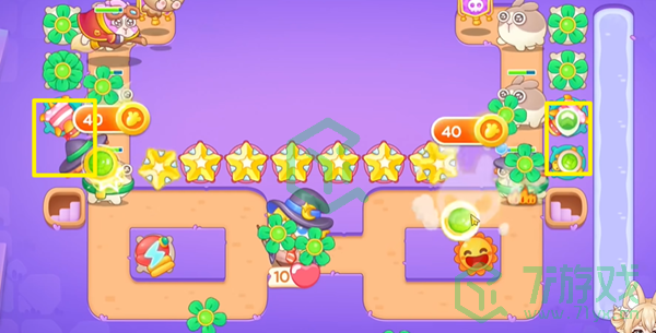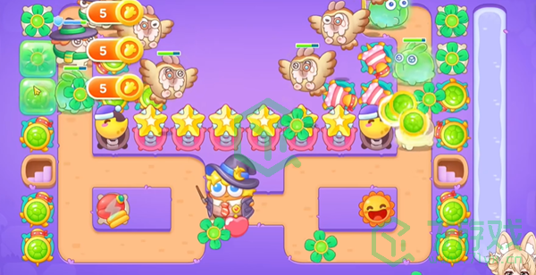 1、开局在两边怪物出来的地方,建造四叶草炮塔并升到满级,在中间建造海星炮塔。如图所示。