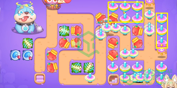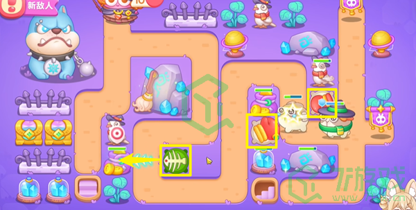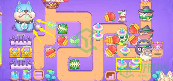 1、开局在右侧拳击炮塔并升级,然后在中间下方放一个鱼刺。