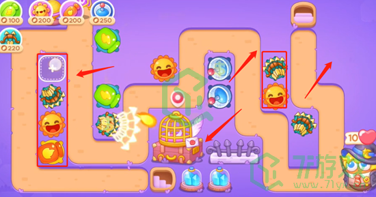 2、打掉帽子后,在魔法阵上放一个多重箭,等打掉右边的叶子后放太阳花,打掉中间的两个魔法帽放雷达。
