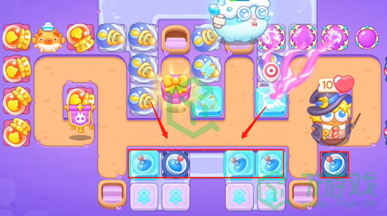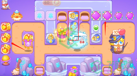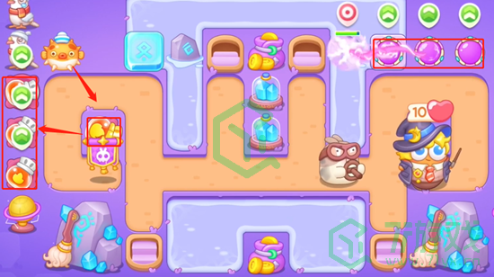 2、用河豚打掉中间的道具放满级喷火器,重点增加魔法球的数量,打掉道具继续放喷火器。