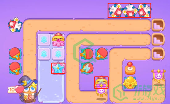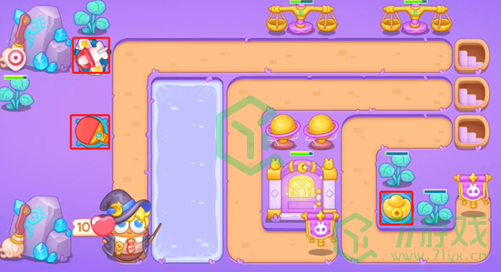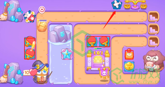 3、打掉水里出现的宝箱获得一个减速星星,然后打掉大道具获得魔法阵,继续放置乒乓球并且升级。