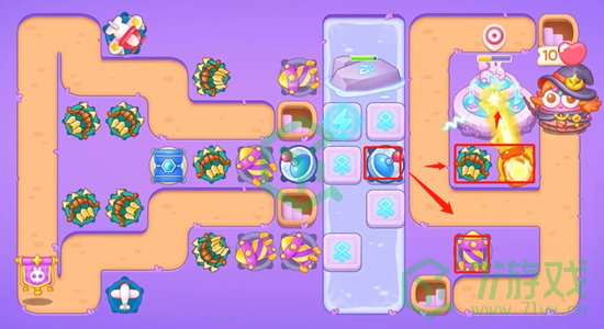 1、先在出口这里放置两个多重箭,打掉中间的道具继续放置冰锥和多重箭。