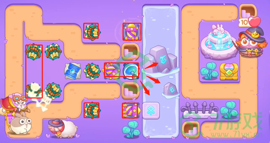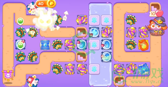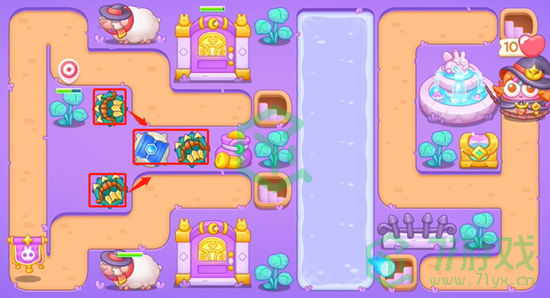 3、水中出现浮板后,继续放置炮台打掉右边的道具,继续放置炮台打掉上面的许愿池。
