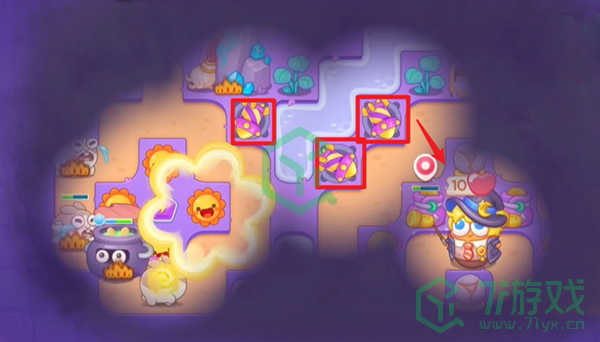 2、右上角放火箭炮塔,左边火箭用来打兔子,去拆萝卜附近的几个道具可以获得很多的金币。