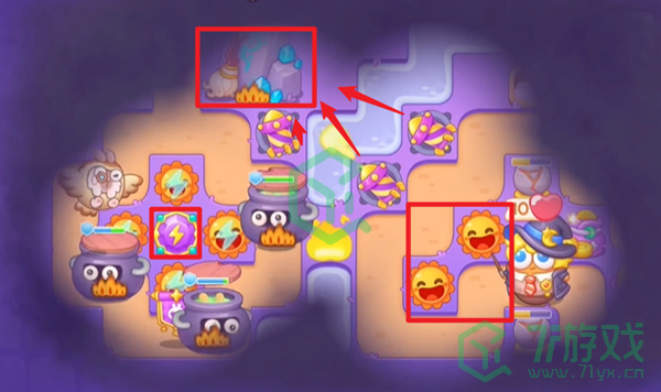 3、右下角拆完后放太阳花并升到满级,把火箭锁定后,去打左上角的大石头。