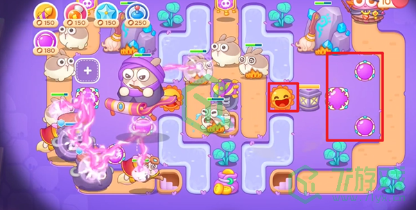 1、在左侧放两个魔法球炮塔并升到满级,清理周围的道具和出现的兔子。