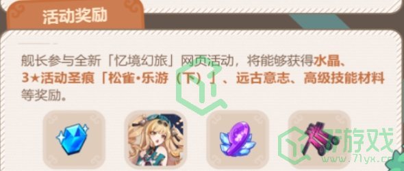 3、参与全新「忆境幻旅」网页活动,能够获得水晶3*活动圣痕「松雀·乐游(下)」、远古意志、高级技能材料等奖励。
