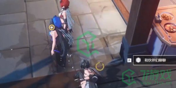 1、先跟随指引来到攀花饭馆这里,和小伙伴们会合,然后来到美食街位置,进入边庭的会客厅和散华对话。