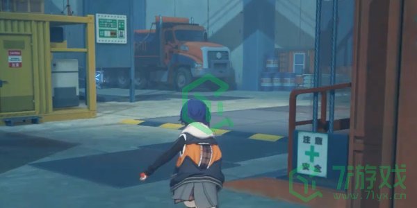 3、来到斜坡上面后,将视角往右转,会发现一辆橙色的大卡车,往大卡车旁边走,位置如图所示。