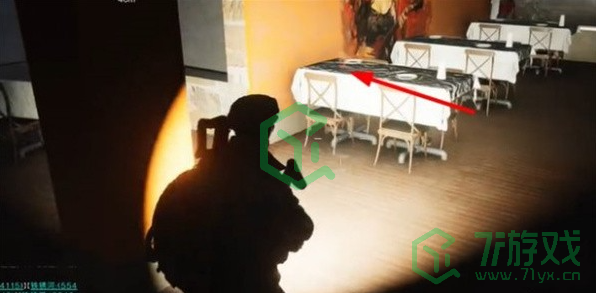3、顺着红色箭头进入下图所示的房间内,进入建筑后继续向右转,就可以看见餐厅了。