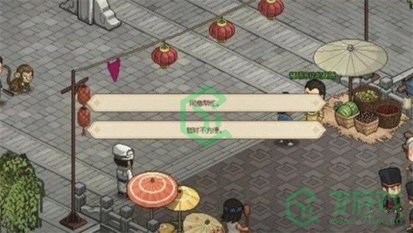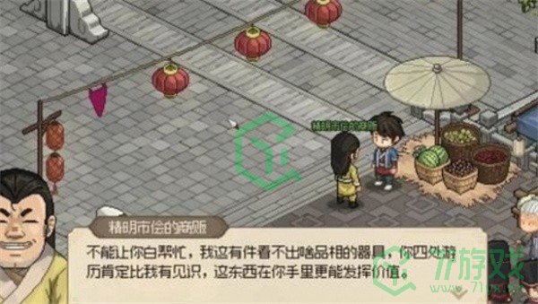 3、酉时的时候来到市集,找NPC精明市侩的商贩对话。