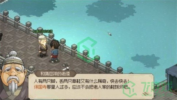 5、最后在西北面桥上找到老者对话,捡起地上的鞋子即可