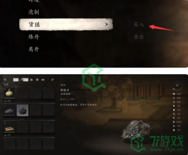 2、来到土地庙后,点击货殖-买入,即可看到【镔铁砂】。