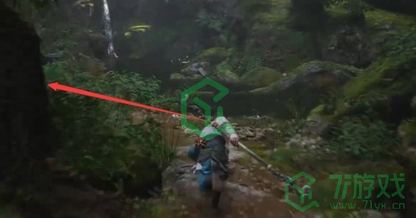3、来到下图所示的池塘附近,按照箭头所示路线往左转。