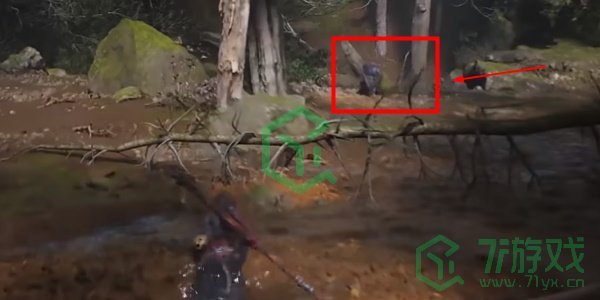 4、沿着溪流一直往前走,来到下图所示的倒下的大树旁,即可触发剧情。