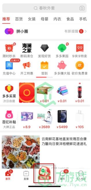 1、打开手机拼多多最新版本,用户可以在下方功能栏中找到“摇现金”活动入口。